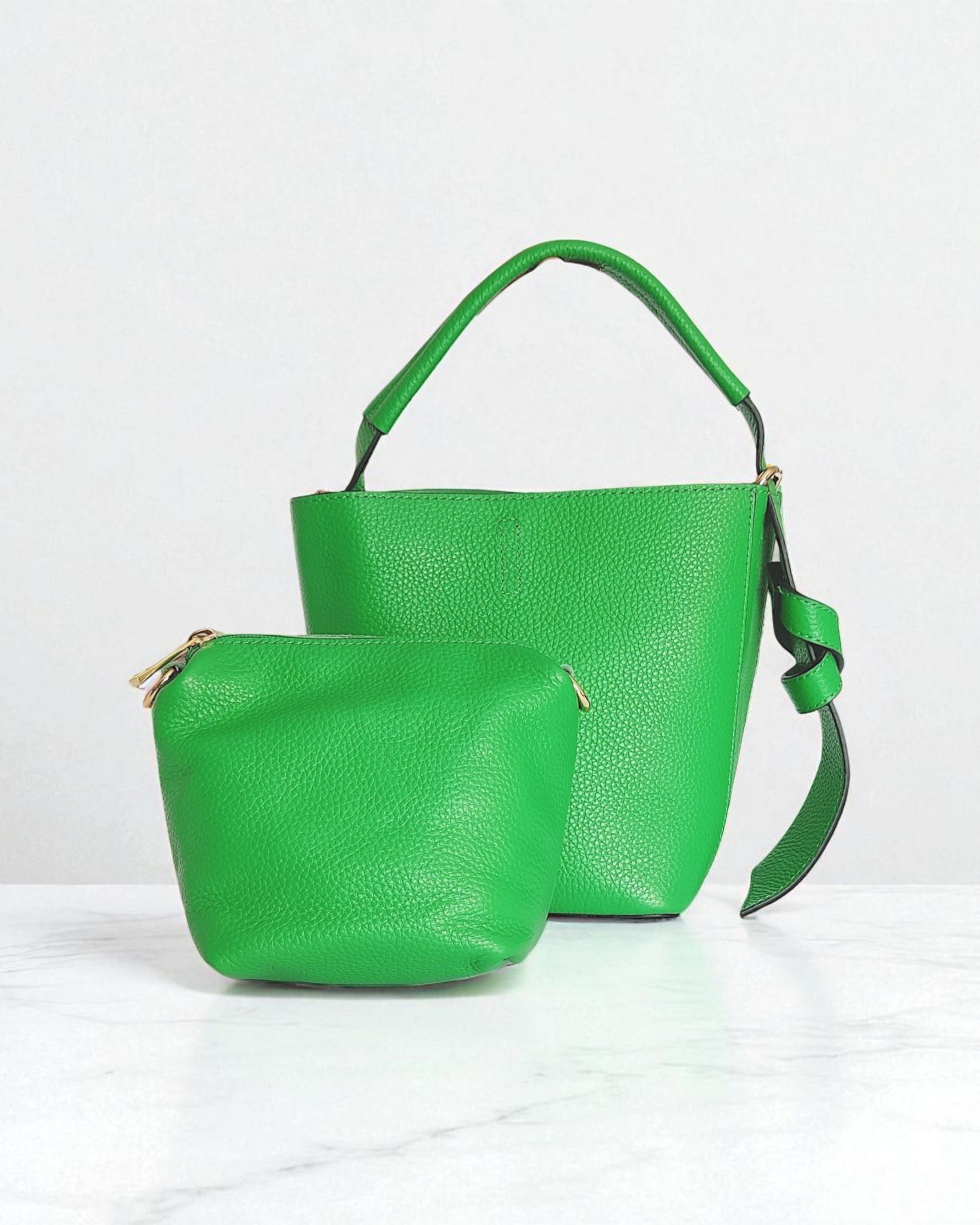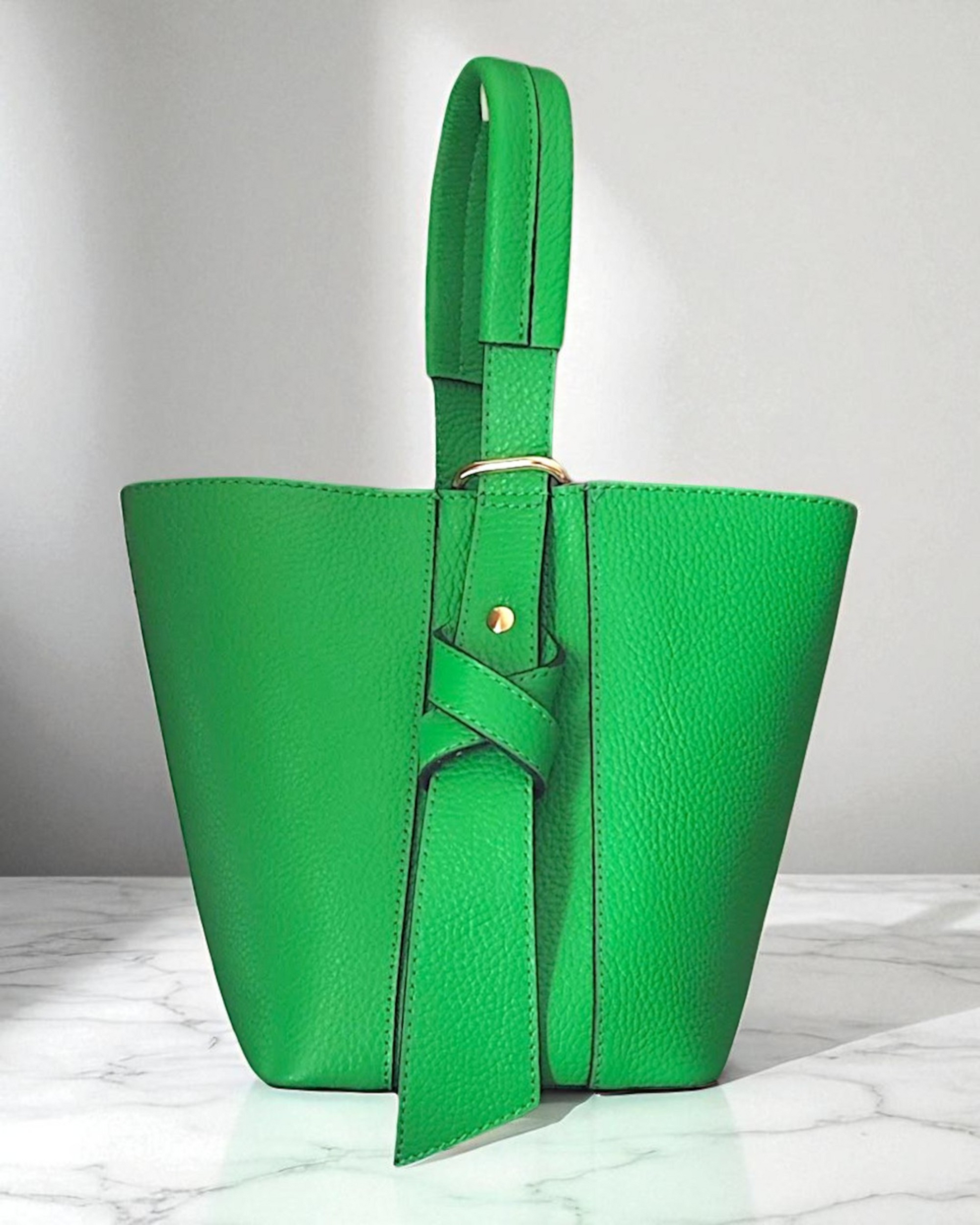 Su diseño tipo bucket confeccionado en piel verde, combina líneas limpias con una funcionalidad impecable. Incluye una pieza interior independiente con cierre de cremallera, ideal para mantener tus esenciales organizados y seguros. Con asas cortas para llevarlo en la mano y una correa adicional para el hombro, adaptándose a tu ritmo de vida diario.